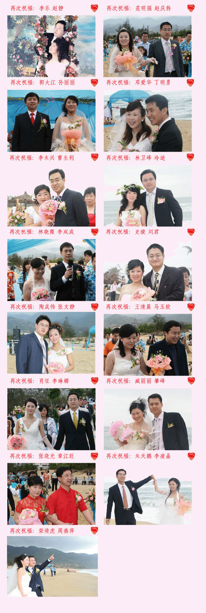 2008年2月在美麗三亞海灘邊進千人位16位新婚同事舉行了一場“千人海邊愛的見證儀式”。明媚的陽光、細膩的沙灘、清澈澄碧的海水、千人祝福,共同見證了這一浪漫時刻,分享他們的激情與喜悅,同事也祝愿他們的愛情永遠甜蜜蜜!