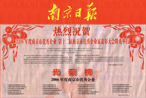 4月30日,南京市人民政府在市委禮堂召開(kāi)表彰大會(huì), 23家企業(yè)被授予“2006年度南京市優(yōu)秀企業(yè)”稱(chēng)號(hào)。