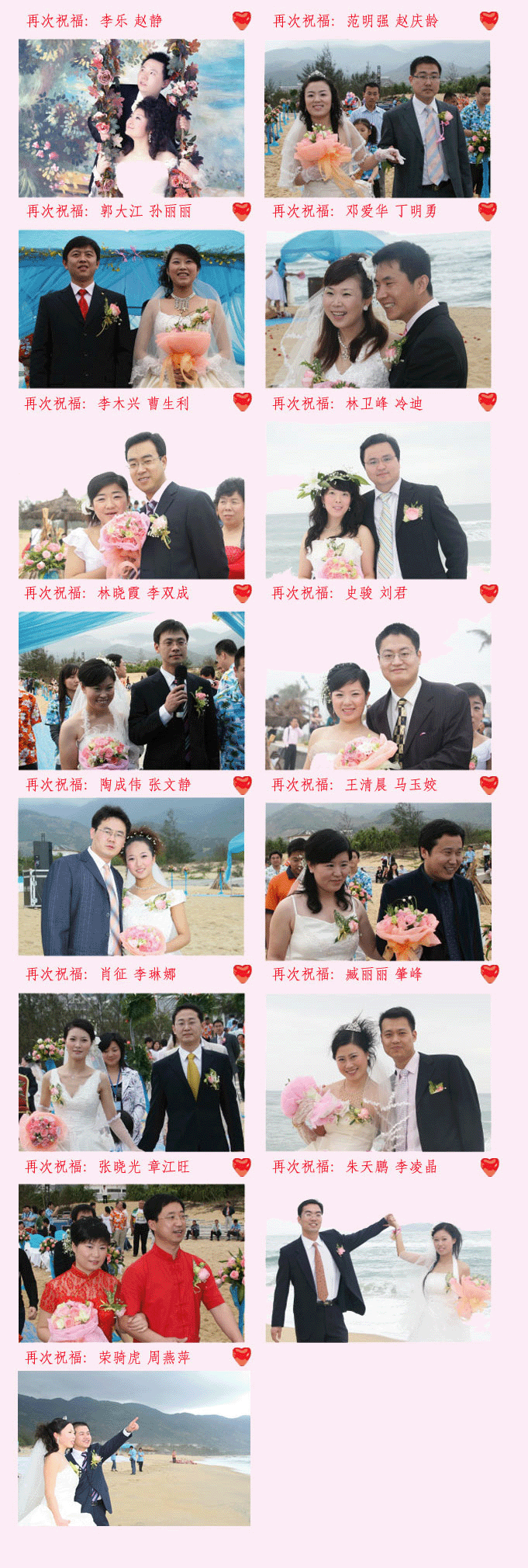 2008年2月在美麗三亞海灘邊進(jìn)千人位16位新婚同事舉行了一場(chǎng)“千人海邊愛(ài)的見(jiàn)證儀式”。明媚的陽(yáng)光、細(xì)膩的沙灘、清澈澄碧的海水、千人祝福,共同見(jiàn)證了這一浪漫時(shí)刻,分享他們的激情與喜悅,同事也祝愿他們的愛(ài)情永遠(yuǎn)甜蜜蜜!