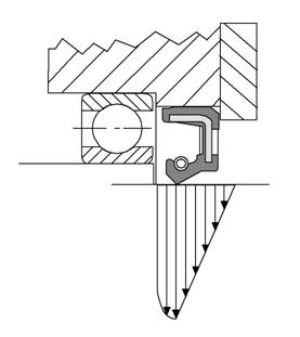 使用之前,油封的唇口內(nèi)徑比軸徑小(旋轉(zhuǎn)孔用油封的唇口外徑比孔徑大),具有一定的過盈量。安裝后,油封由于唇口過盈和自緊彈簧(帶有彈簧的油封)的收縮會對旋轉(zhuǎn)軸產(chǎn)生一定的徑向壓力。同時,油封在彈簧收縮而產(chǎn)生的抱緊力作用下,能夠克服軸在旋轉(zhuǎn)狀態(tài)下因軸的振動、跳動所產(chǎn)生的間隙,使油封的唇口能夠緊貼在軸的表面上。工作時,油封唇口與旋轉(zhuǎn)軸表面形成一個密封接觸環(huán)帶。在密封腔內(nèi)油壓的作用下,潤滑油滲入油封唇口與旋轉(zhuǎn)軸之間形成極薄的一層油膜。油膜受油液表面張力的作用,在旋轉(zhuǎn)軸表面和油封唇口外沿之間形成一個“新月面”防止油液外溢,起到密封的作用;另一方面還可以起到油封唇口與軸表面之間的潤滑作用。